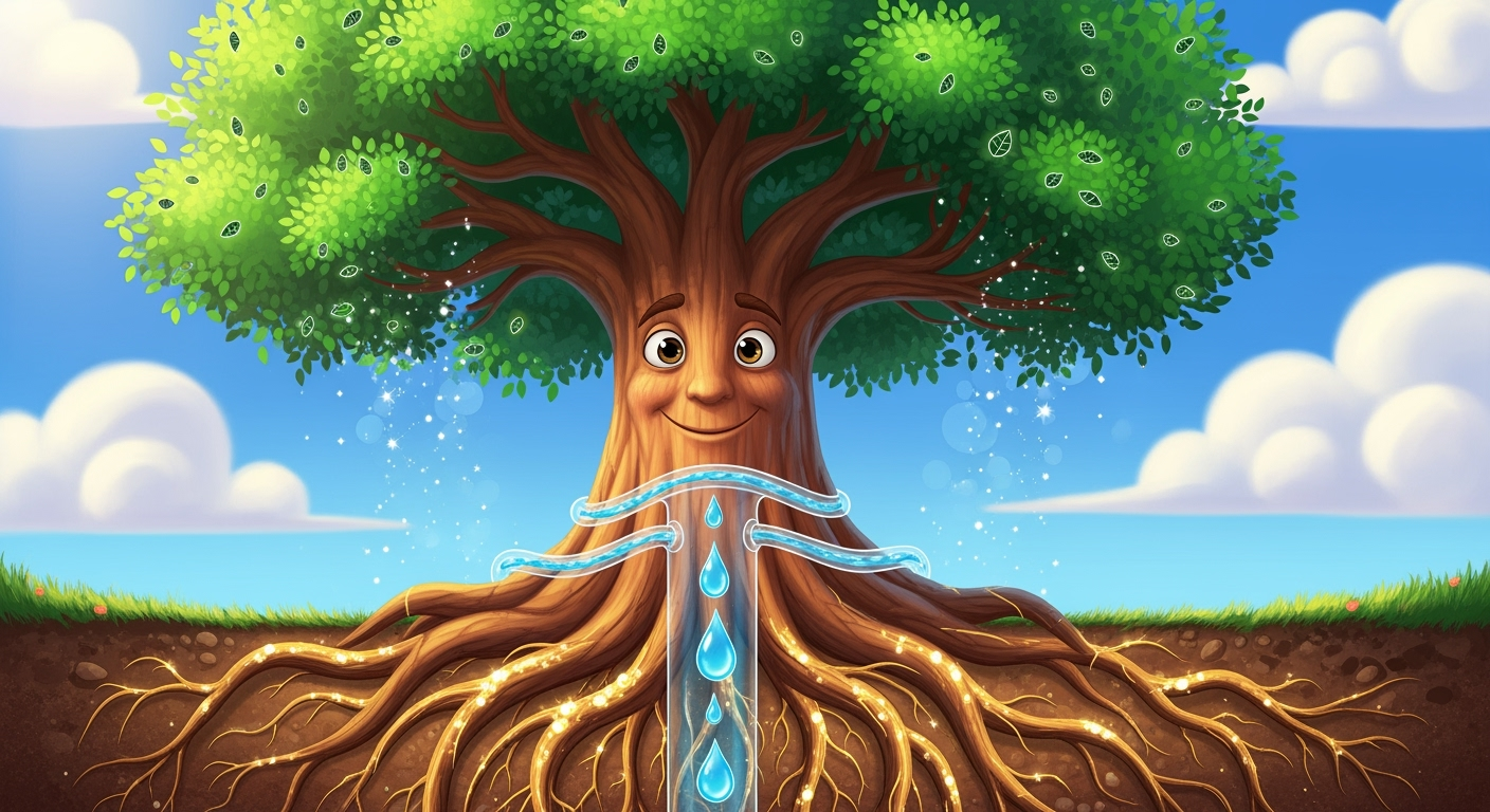 Now that you know the amazing secret of how trees drink water, every tree you see will look different! Next time you walk past a tree, remember that it’s not just standing there doing nothing. It’s busy drinking water with millions of tiny root hairs, pumping water up through its trunk pipes, and cooking food in its leaf kitchen!