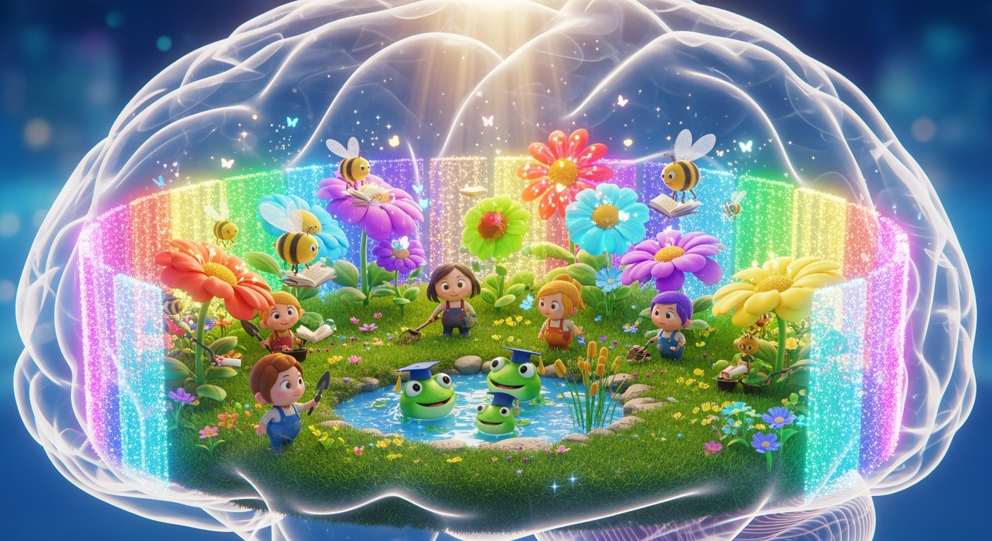 Close your eyes and picture this: Inside your mind, there’s the most beautiful garden you can imagine! Maybe it has bright purple flowers that sparkle in the sunlight. Maybe there’s a tiny pond with friendly frogs that go “ribbit” when you think clearly. Some gardens might have singing birds, others might have butterflies that dance between the thoughts!