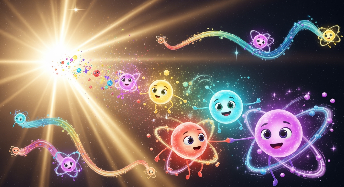 Here’s where it gets super exciting! Everything around you – your toys, your pet, your sandwich, even you – is made of tiny building blocks called atoms (that means “the smallest pieces that make up everything”). Atoms are like cosmic LEGO blocks that stick together to build all the things we see!