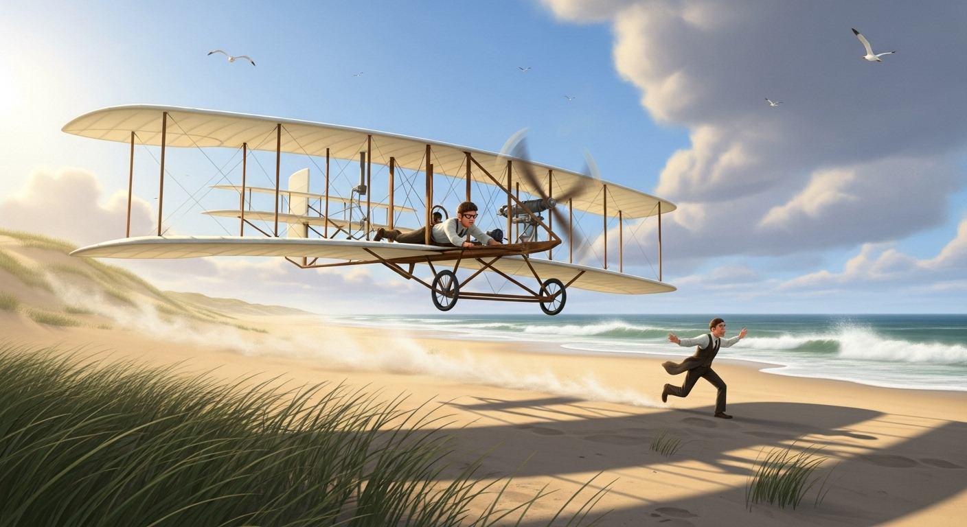 Picture a cold December morning in 1903. Sand sparkles with frost, and the ocean waves crash nearby. Two men in dark coats stand next to a strange wooden machine with white canvas wings. One brother lies down on the lower wing while the other steadies the contraption. An engine coughs to life, propellers spin, and suddenly… the machine lifts off the ground! For just 12 seconds, it flies through the air like a giant bird. This wasn’t magic – this was the very first powered airplane flight in history, piloted by Orville Wright while his brother Wilbur watched from the ground!
