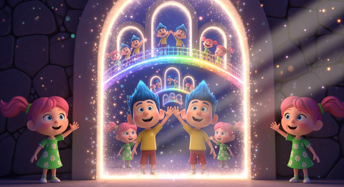 Imagine this: You’re in your bedroom playing with your favorite toys when suddenly – POOF! – a magical, shimmering door appears right next to your closet! This isn’t just any ordinary door. It’s sparkly like glitter and makes soft whooshing sounds. But here’s the most amazing part – this door leads to a parallel world (that means another world that’s almost exactly like ours, but different in special ways)!